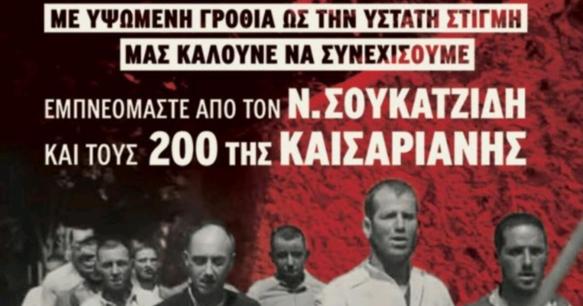Η ΤΕ Ηρακλείου του ΚΚΕ, τιμώντας τους 200 ήρωες της Καισαριανής που μέσα σε αυτούς είναι και ο ήρωας Ναπολέοντας Σουκατζίδης, που έζησε και έδρασε στο Ηράκλειο πριν συλληφθεί και οδηγηθεί στην αθανασία μαζί με τους υπόλοιπους συντρόφους του, διοργανώνει Μεγάλη Πολιτική – Πολιτιστική Εκδήλωση με τίτλο : «Με υψωμένη γροθιά ως την ύστατη στιγμή… Μας καλούνε να συνεχίσουμε εμπνεόμαστε από τον Ν. ΣΟΥΚΑΤΖΙΔΗ κα τους 200 της Καισαριανής» αύριο Τετάρτη 29 Απριλίου 2026, στις 19:00 το απόγευμα, στο Πολιτιστικό Συνεδριακό Κέντρο Ηρακλείου.