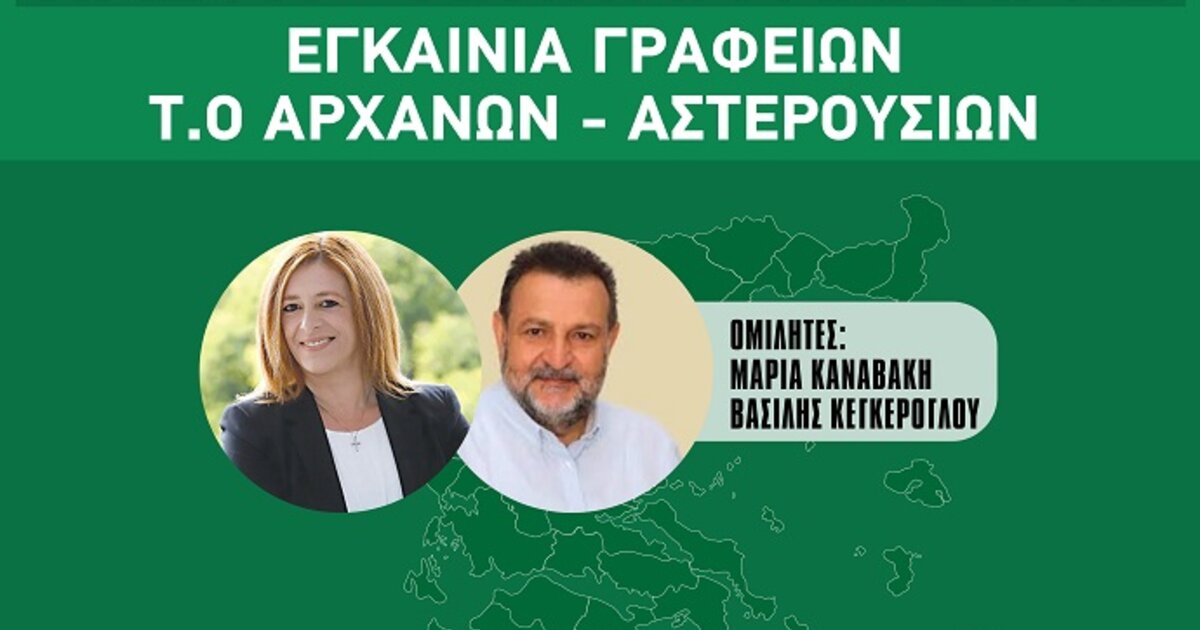 Αύριο Τετάρτη 19 Απριλίου, στις 19:30 το απόγευμα, θα πραγματοποιηθούν τα εγκαίνια των γραφείων της Τοπικής Οργάνωσης Αρχανών - Αστερουσίων του ΠΑΣΟΚ-Κινήματος Αλλαγής, επί της οδού Γεωργίου Καπετανάκη στις Αρχάνες.