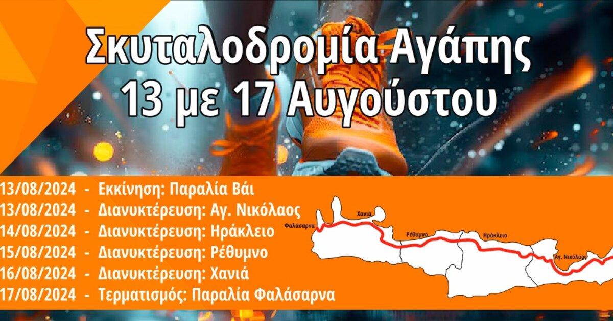 "Σκυταλοδρομία Αγάπης" από τις 13 έως τις 17 Αυγούστου, με εκκίνηση την παραλία Βάι στον νομό Λασιθίου και τερματισμό την παραλία Φαλάσαρνα στον νομό Χανίων.