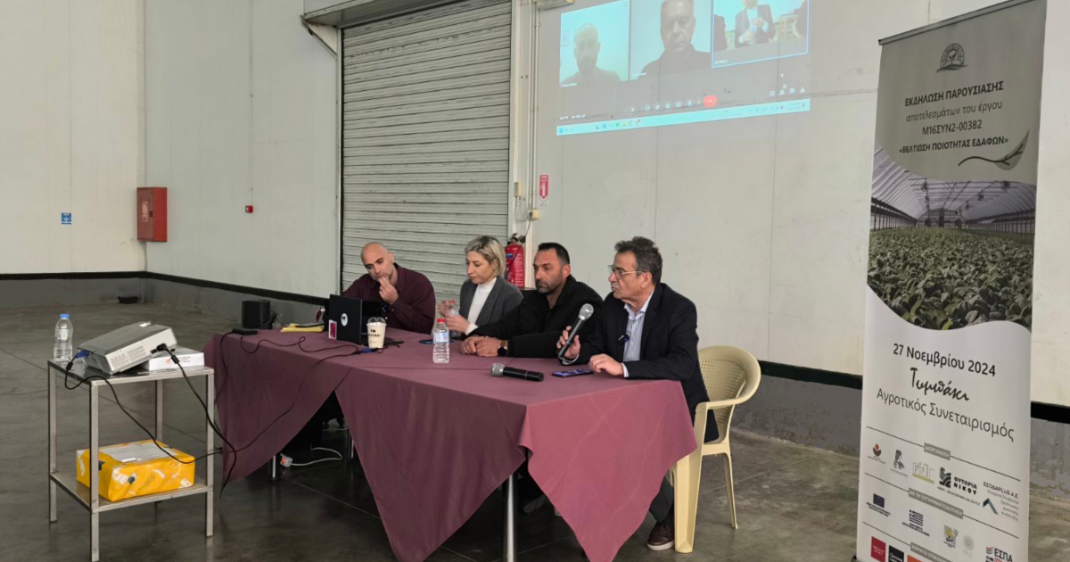 Με επιτυχία ολοκληρώθηκε η εκδήλωση παρουσίασης των αποτελεσμάτων του έργου Μ16ΣΥΝ2-00382 "Βελτίωση Ποιότητας Εδαφών", η οποία πραγματοποιήθηκε στις 27 Νοεμβρίου 2024, στην έδρα του Αγροτικού Οπωροκηπευτικού – Ελαιουργικού Συνεταιρισμού Τυμπακίου. Το έργο, που εντάσσεται στο πλαίσιο του Μέτρου 16 του Προγράμματος Αγροτικής Ανάπτυξης (Π.Α.Α.) 2014-2020 του Υπουργείου Αγροτικής Ανάπτυξης και Τροφίμων και συγχρηματοδοτείται από το Ευρωπαϊκό Γεωργικό Ταμείο Αγροτικής Ανάπτυξης (Ε.Γ.Τ.Α.Α.), συγκέντρωσε εκπροσώπους από τον ακαδημαϊκό και τον γεωργικό τομέα για να συζητήσουν καινοτόμες προσεγγίσεις στη διαχείριση και αποκατάσταση υποβαθμισμένων εδαφών.