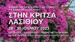 Το 6ο Βιωματικό Σεμινάριο Πολιτισμού με έμφαση στον Χορό θα διεξαχθεί φέτος στην Κρήτη και συγκεκριμένα σε ένα από τα αρχαιότερα κεφαλοχώρια του νησιού, στην ΚΡΙΤΣΑ ΛΑΣΙΘΙΟΥ στις ημερομηνίες : 28 Ιουλίου – 30 Ιουλίου 2023 | Οργάνωση - Διδασκαλία : Γιάννης Μεγαλακάκης