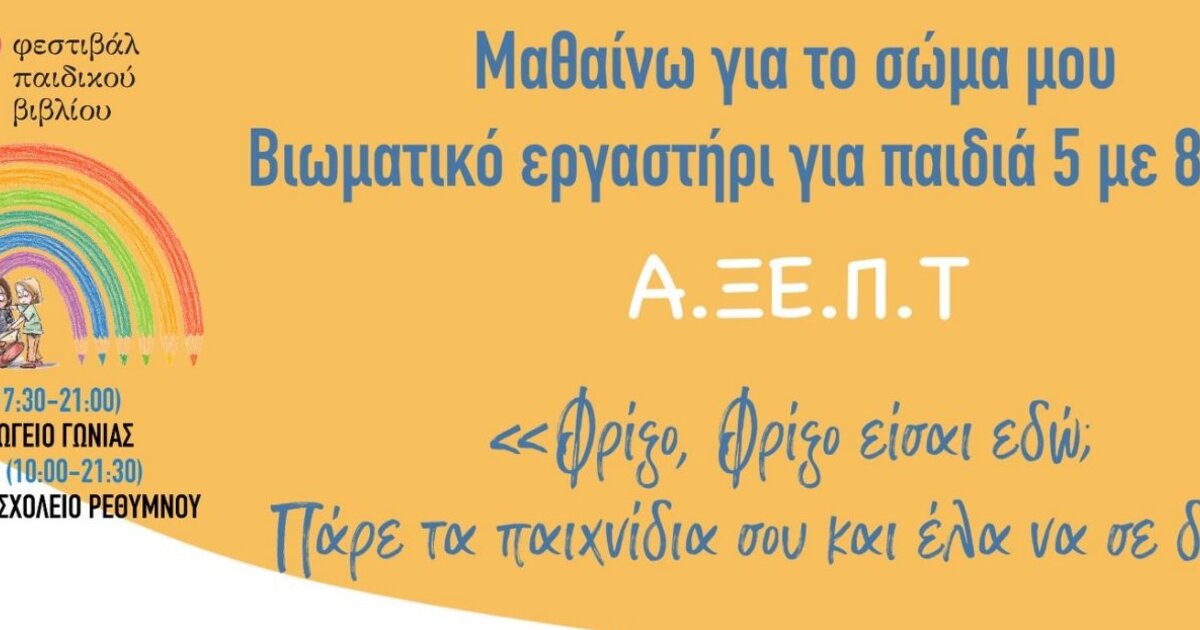 Βιωματικό εργαστήριο σεξουαλικής αγωγής διοργανώνει η Α.Ξ.Ε.Π.Τ. (Ασφαλή Ξένοιαστα Παιδιά Τώρα), η βραβευμένη ομάδα του Φρίξου, με θέμα: «Παίζω με τον Φρίξο και μαθαίνω για το σώμα μου και τις διαπροσωπικές σχέσεις». Απευθύνεται σε παιδιά ηλικίας 5-8 ετών την Κυριακή 1 Ιουνίου 2025 και ώρες 4.30μμ – 6μμ στο Φεστιβάλ Παιδικού Βιβλίου, στο 2ο Δημοτικό Σχολείο Ρεθύμνου.