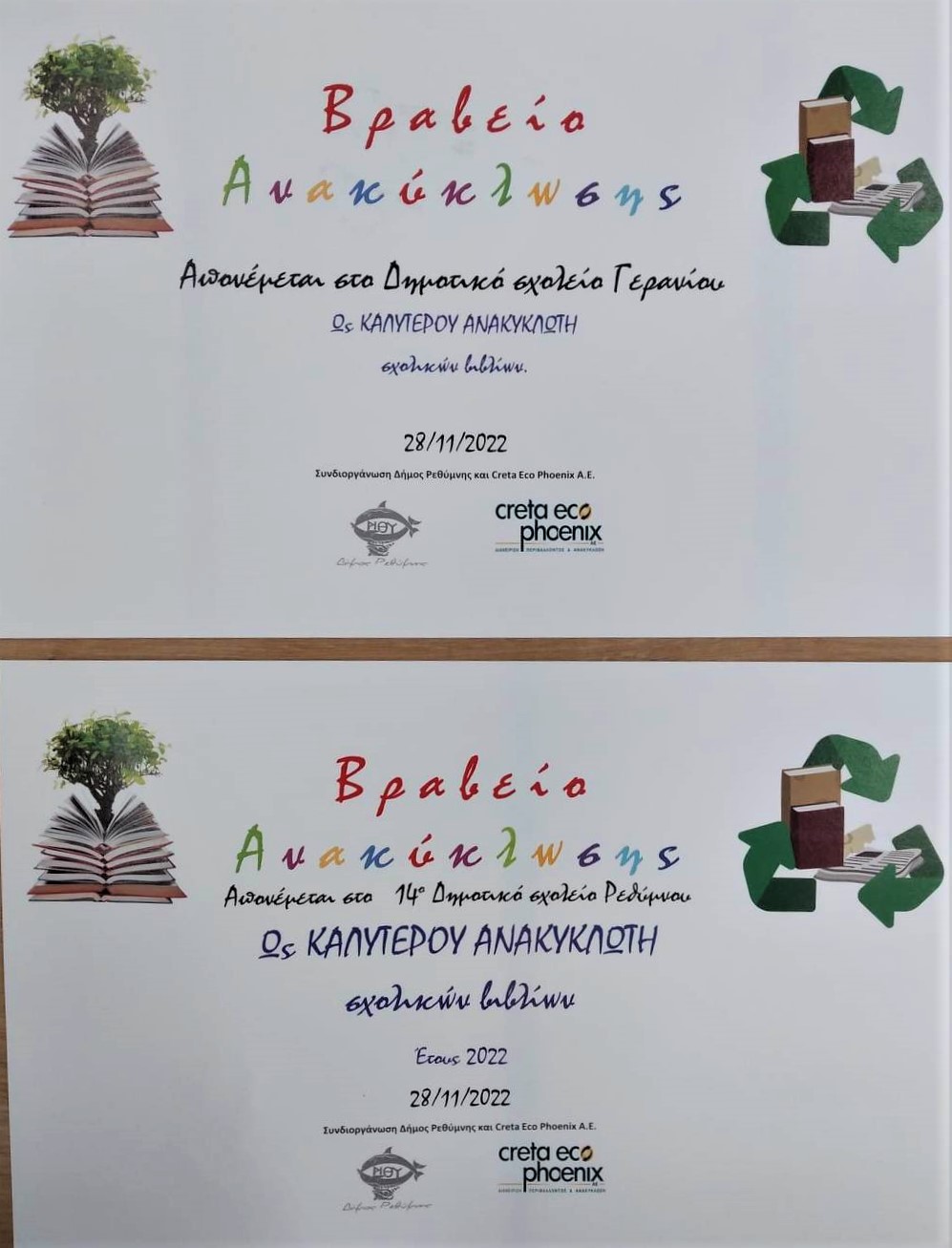 Βραβείο ανακύκλωσης απένειμε ο Δήμαρχος Ρεθύμνης στο 14ο Δημοτικό και στο Δημ. Σχολείο Γερανίου