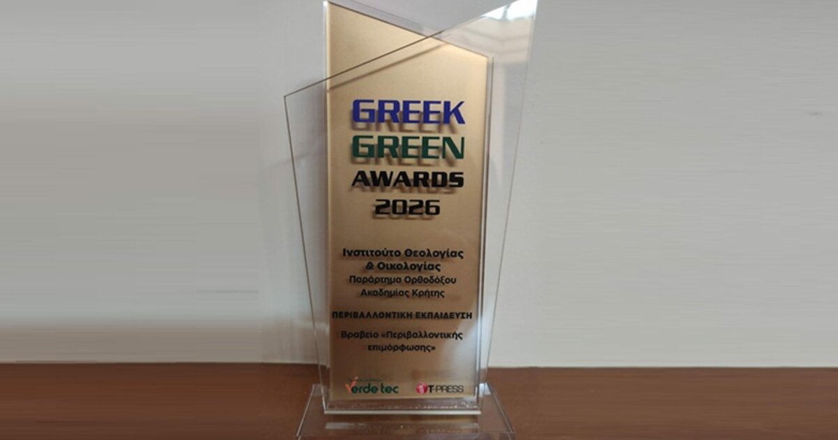 Μία εθνική αναγνωρισμένη διάκριση εξαιρετικής σημασία απονεμήθηκε στο Ινστιτούτο Θεολογίας & Οικολογίας – Παράρτημα της Ορθοδόξου Ακαδημίας Κρήτης (ΟΑΚ), το οποίο τιμήθηκε το Σάββατο 28 Φεβρουαρίου με την ανώτατη διάκριση στην κατηγορία «Περιβαλλοντική Εκπαίδευση», λαμβάνοντας το κορυφαίο βραβείο «Περιβαλλοντικής Επιμόρφωσης», στο πλαίσιο των Greek Green Awards 2026, που πραγματοποιήθηκαν κατά τη διάρκεια της 8ης Διεθνούς Έκθεσης Verde.Tec.