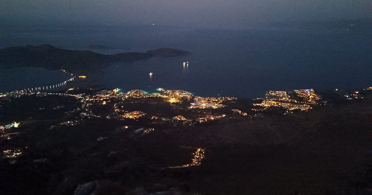 Ακολουθούμε λοιπόν το καλά σηματοδοτημένο μονοπάτι κι αρχίζει σιγά-σιγά ν’ ανοίγεται η θέα γύρω μας προς όλες τις κατευθύνσεις. Στα ανατολικά ο κόλπος του Μεραμπέλλου με τα απέναντι βουνά (απ’ όπου σε λίγο θ’ ανατείλει το φεγγάρι). Στα ΒΔ η Ελούντα, η Κολοκύθα κι ο στενός σαν μπουκάλι κόλπος με τη Σπιναλόγκα σαν φελλό στην άκρη του. ΝΔ σκοτεινοί όγκοι οι κορυφές της Τσίβης και της Σελένας.
