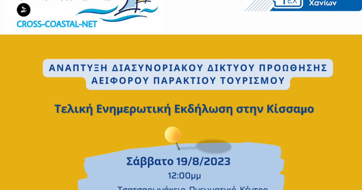 To Επιμελητήριο Χανίων, ως επικεφαλής εταίρος του έργου με τίτλο «Ανάπτυξη Διασυνοριακού Δικτύου Προώθησης Αειφόρου Παράκτιου Τουρισμού» και ακρωνύμιο CROSS-COASTAL-NET, διοργανώνει την Τελική Ενημερωτική Εκδήλωση του έργου στην Κίσσαμο το Σάββατο 19 Αυγούστου στις 12:00μμ στο Τσατσαρωνάκειο Πνευματικό Κέντρο.