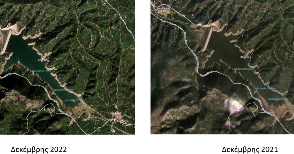 Συγκεκριμένα, σύμφωνα με τις εικόνες που επεξεργάστηκε το Εργαστήριο Τηλεπισκόπησης και Εφαρμογών σε Αστικό και Φυσικό Περιβάλλον (http://rslab.gr) του Ινστιτούτου Υπολογιστικών Μαθηματικών του ΙΤΕ, συγκριτικά, τον Δεκέμβριο του 2021 φαίνεται πως τα φράγματα Μπραμιανών, Αποσελέμη και Φανερωμένης είχαν λιγότερο νερό σε σχέση με τον Δεκέμβριο του 2022.