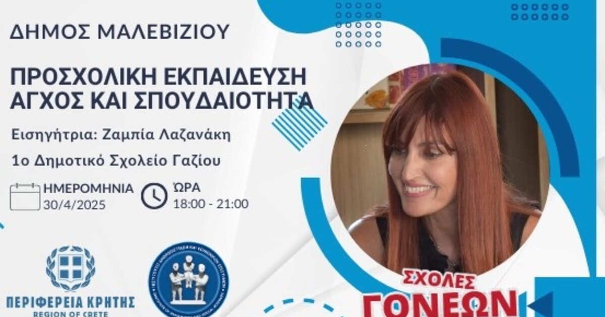 «Προσχολική Εκπαίδευση, άγχος και σπουδαιότητα» είναι το θέμα της 2ης συνάντησης στο πλαίσιο της Σχολής Γονέων που διοργανώνουν η Περιφέρεια Κρήτης σε συνεργασία με το Ινστιτούτο Ανθρωπιστικών και Κοινωνικών Επιστημών με την υποστήριξη του Δήμου Μαλεβιζίου.