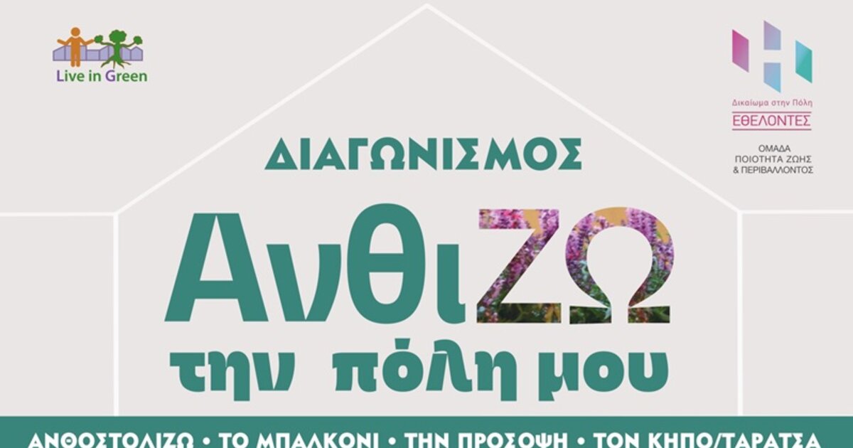 Από τους Εθελοντές "Δικαίωμα στην Πόλη" και την Ομάδα Ποιότητας Ζωής και Περιβάλλοντος, διοργανώνεται ο πρώτος Διαγωνισμός «ΑνθίΖω την πόλη μου», μια περιβαλλοντική γιορτή, που επιδιώκει να γίνει θεσμός και αφορμή για να μπει ξανά η φύση στην καθημερινότητα μας.