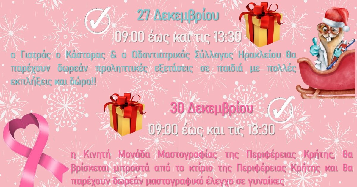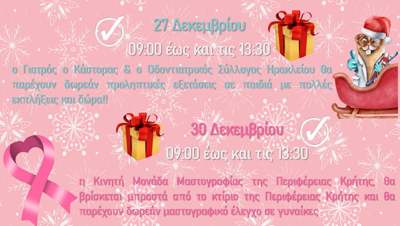 Στο πλαίσιο αυτό διοργανώνονται στις 27 και 30 Δεκεμβρίου δράσεις με γιορτινές εκπλήξεις για μικρούς και μεγάλους μπροστά από το κτίριο της Περιφέρειας Κρήτης, όπου γυναίκες και μικροί μαθητές θα μπορούν να υποβληθούν σε δωρεάν προληπτικές εξετάσεις στις Κινητές Μονάδες Μαστογραφίας και Οδοντιατρικής φροντίδας της Περιφέρειας Κρήτης