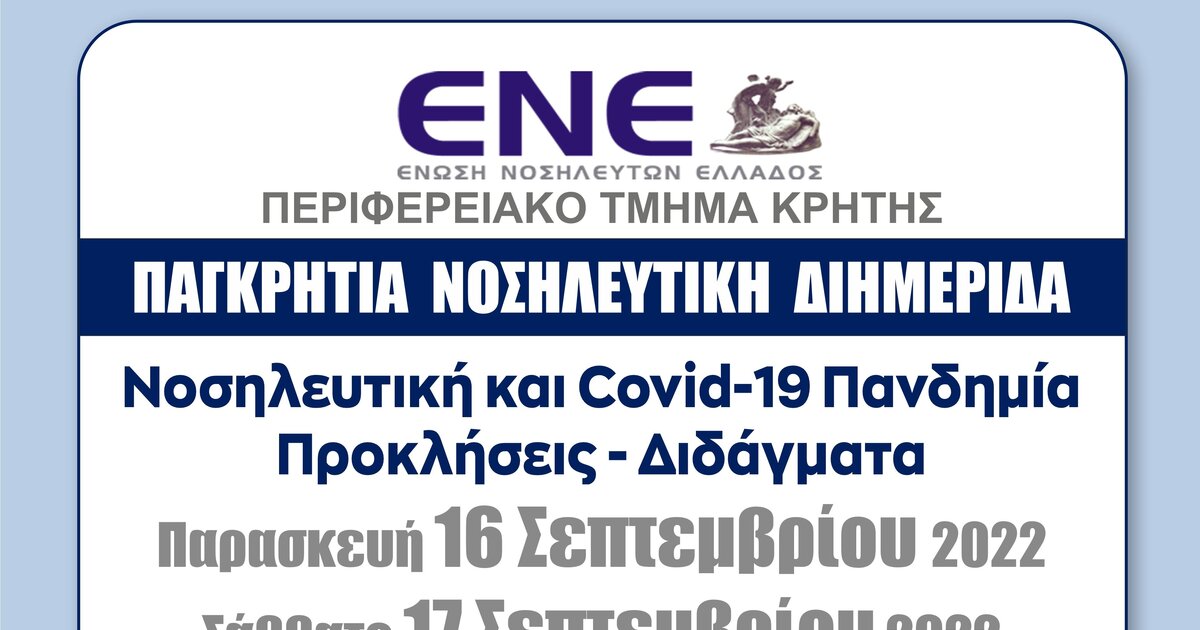 Προγραμματισμένη είναι η Παγκρήτια Νοσηλευτική διημερίδα με θέμα: «Νοσηλευτική και Covid- 19 Πανδημία «Προκλήσεις - Διδάγματα» που θα πραγματοποιηθεί με την στήριξη της Περιφέρειας Κρήτης στο Ηράκλειο, στην αίθουσα Καστελλάκη του Επιμελητηρίου Ηράκλειου την Παρασκευή 16 και το Σάββατο 17 Σεπτεμβρίου 2022.