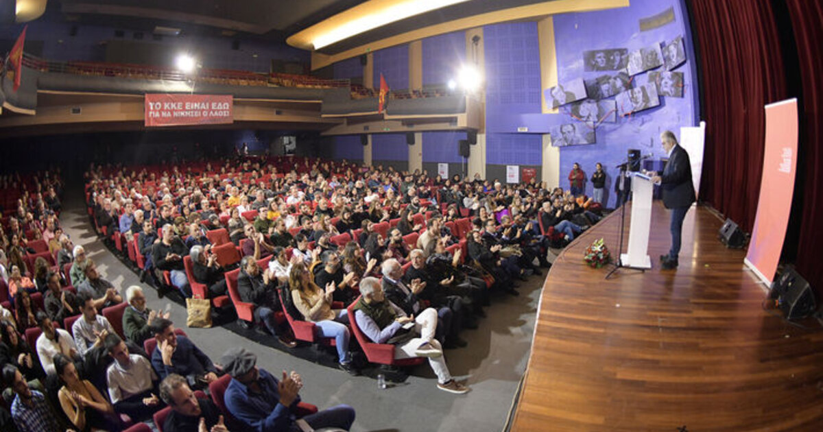 Η αίθουσα του κινηματοθέατρου «Αστόρια», στο κέντρο του Ηράκλειου, γέμισε από μέλη του ΚΚΕ και της ΚΝΕ, από φίλους και οπαδούς του Κόμματος που έδωσαν και δίνουν καθημερινά την μάχη για να δυναμώσει η αγωνιστική συμπόρευση με το ΚΚΕ σε κάθε χώρο δουλειάς και συνοικία.
