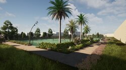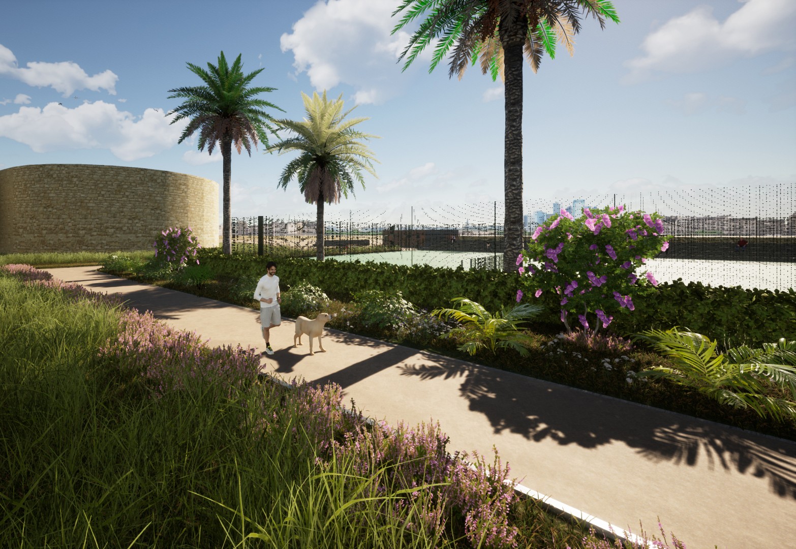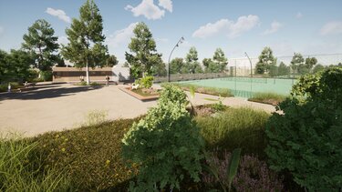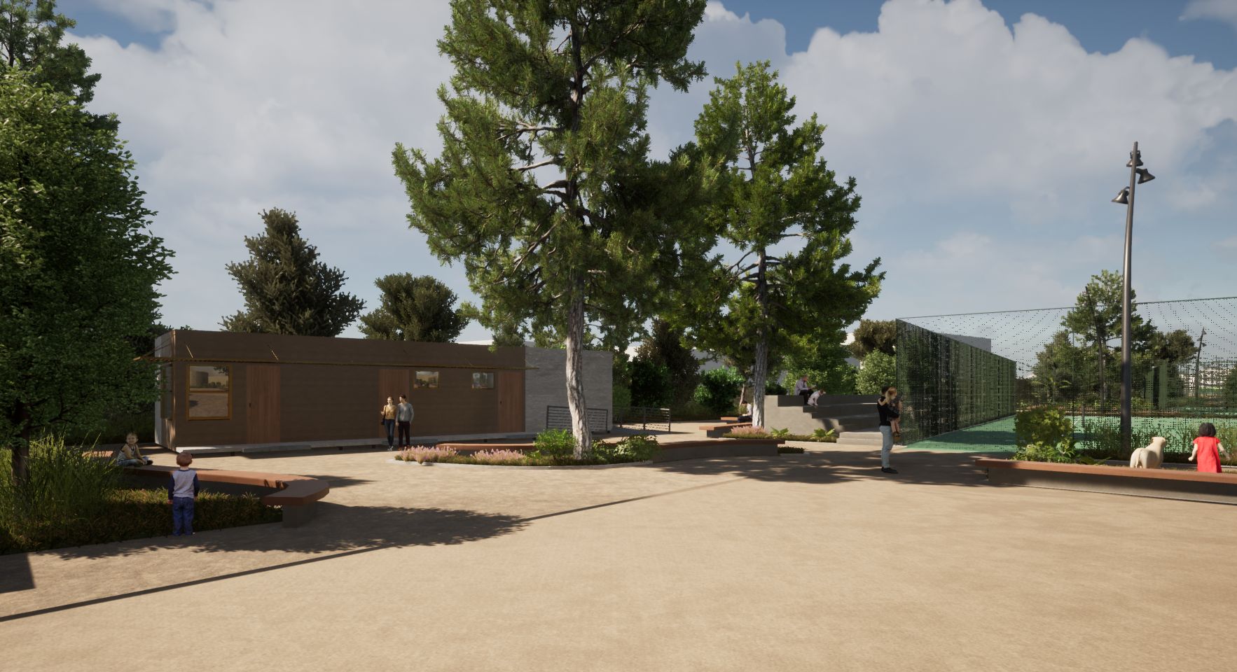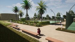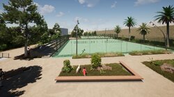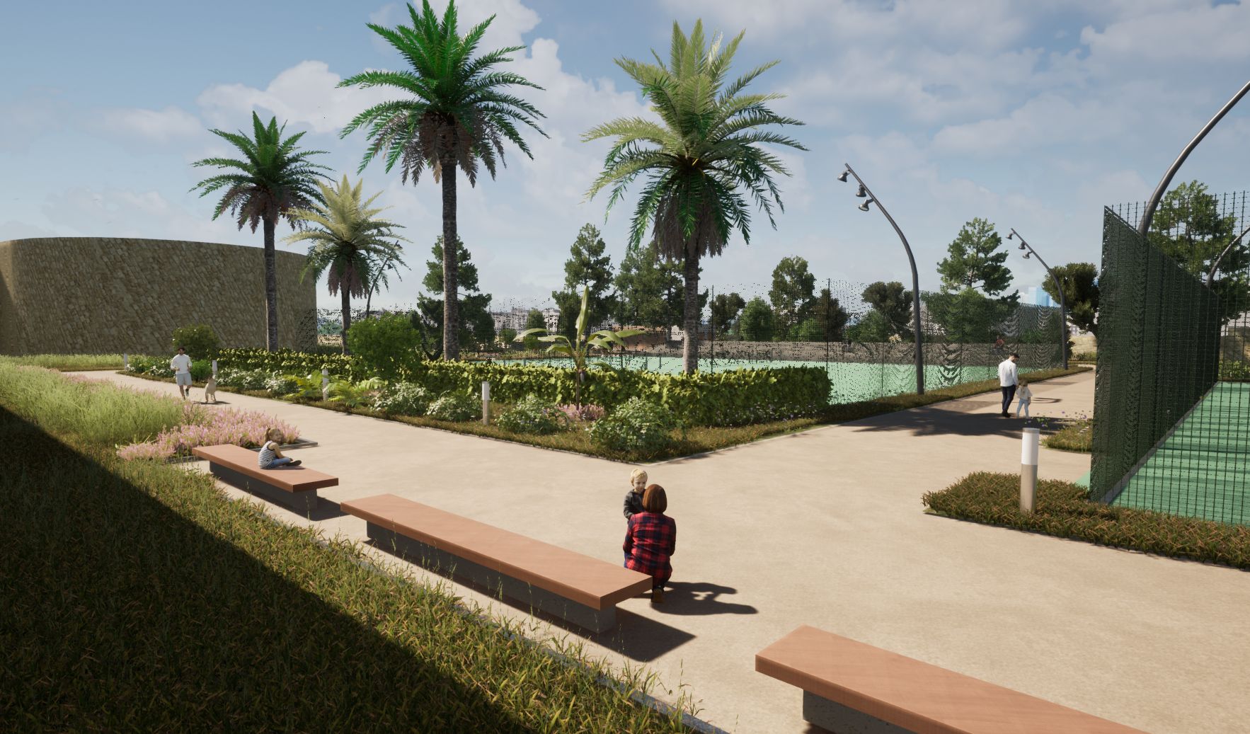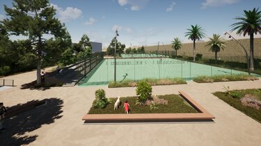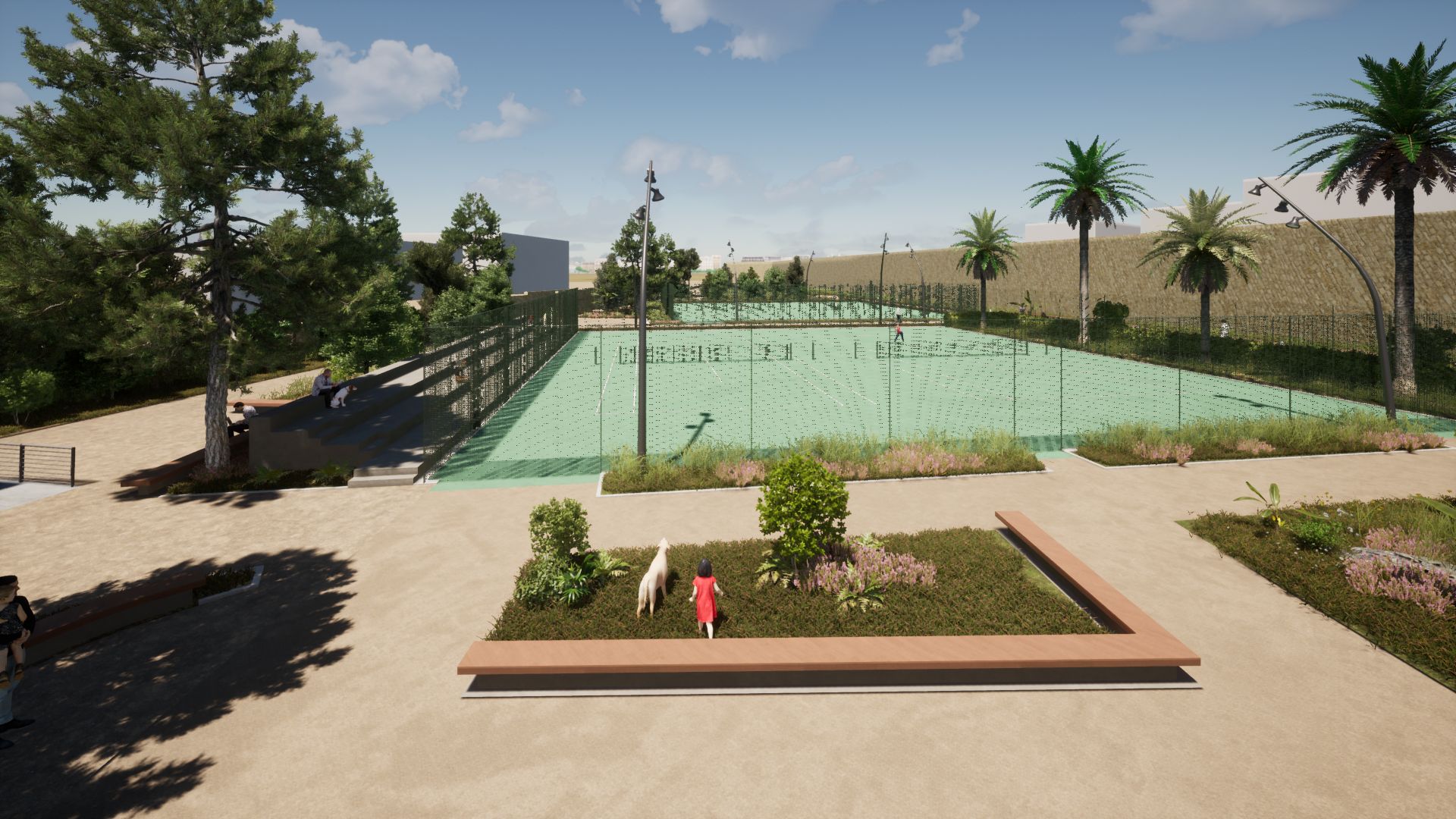 Σύμφωνα με τον προγραμματισμό θα κατασκευαστούν σε νέα θέση δύο διπλά γήπεδα συνολικού εμβαδού 1.273 μ², νέα πτυσσόμενη περίφραξη ελαφριάς κατασκευής και θα τοποθετηθεί λυόμενος οικίσκος αποδυτηρίων. Οι εργασίες περιλαμβάνουν επίσης εκσκαφές, καθαιρέσεις, κατασκευή νέων κρασπέδων από σκυρόδεμα, διαμόρφωση παρτεριών και δαπέδωση με εμφανή αδρανή υλικά λατομείου ίδιου τύπου με αυτά που έχουν χρησιμοποιηθεί στις διαδρομές του Ισόπεδου Τμήματος. Προβλέπεται επίσης κατασκευή καθιστικών από σκυρόδεμα με επένδυση από λωρίδες ξυλείας, τοποθέτηση φωτιστικών σωμάτων LED, νέες φυτεύσεις με σύστημα άρδευσης και τοποθέτηση μικρών ξύλινων κάδων απορριμμάτων στον περιβάλλοντα χώρο.