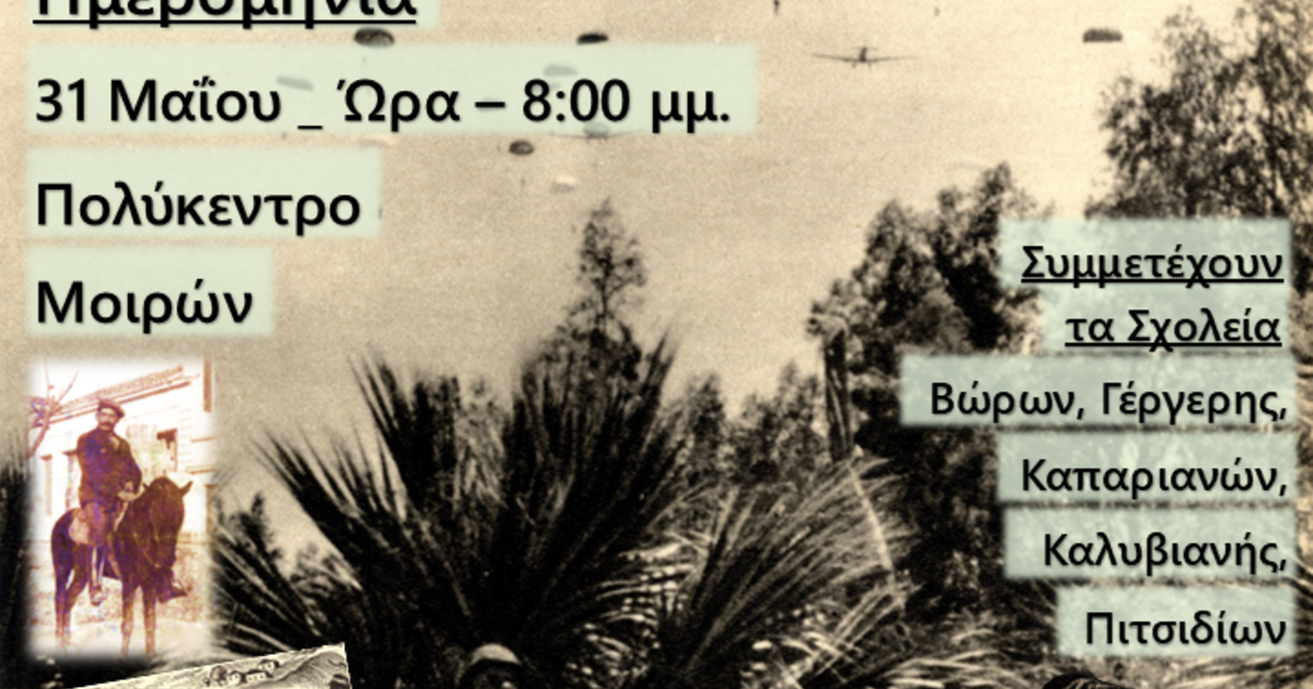 Ο Δήμος Φαιστού και η Τοπική Κοινότητα Μοιρών, σε συνδιοργάνωση με την Περιφέρεια Κρήτης και με συνεργασία σχολείων της περιοχής, Βώρων, Γέργερης, Καπαριανών, Καλυβιανής και Πιτσιδίων, τιμά την 84η Επέτειο της Μάχης της Κρήτης με μια ξεχωριστή σχολική εκδήλωση με τίτλο: «Στον απόηχο της Μάχης...» – Κατοχικά Χρόνια Μεσαράς