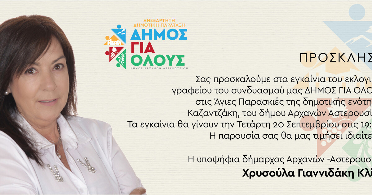 Πρόσκληση στα εγκαίνια του εκλογικού γραφείου του συνδυασμού "ΔΗΜΟΣ ΓΙΑ ΟΛΟΥΣ",στις Αγιές Παρασκιές της δημοτικής ενότητας Καζαντζάκη , του δήμου Αρχανών Αστερουσίων, απευθύνει η επικεφαλής και υποψήφια Δήμαρχος Χρυσούλα Γιαννιδάκη -Κλίνη.