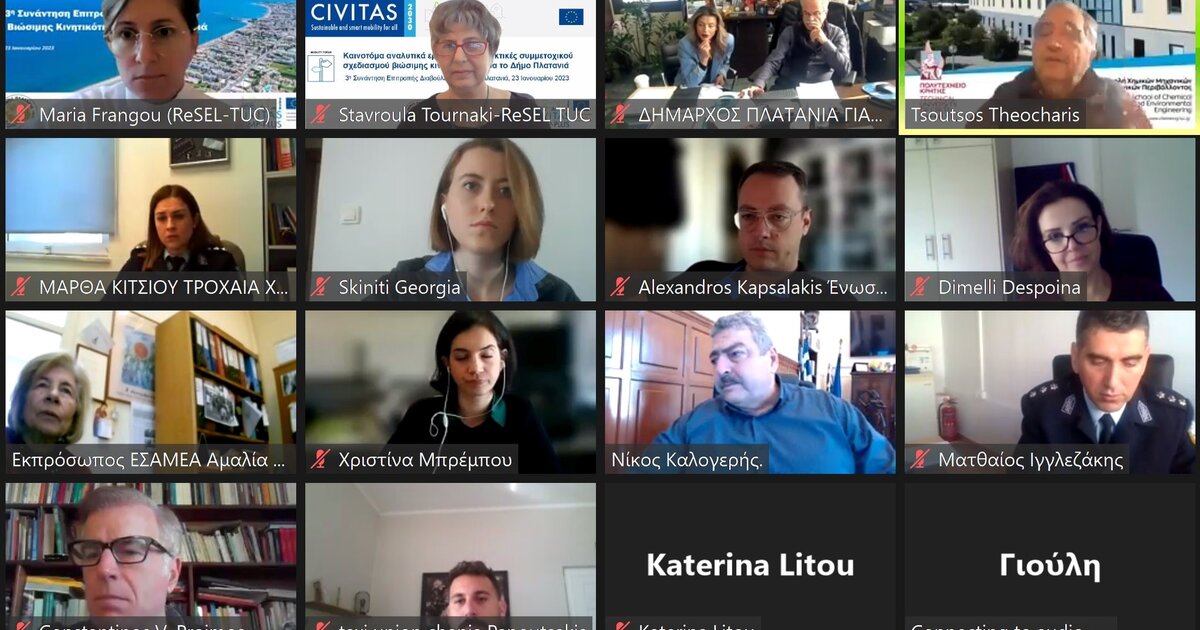 Με επιτυχία πραγματοποιήθηκε, η 3η συνάντηση εργασίας της Επιτροπής Διαβούλευσης ΣΒΑΚ Πλατανιά για το στρατηγικό Σχέδιο Βιώσιμης Αστικής Κινητικότητας (ΣΒΑΚ) για κατοίκους και επισκέπτες στο Δήμο Πλατανιά. Η διαδικτυακή συνάντηση διοργανώθηκε από το Εργαστήριο Ανανεώσιμων και Βιώσιμων Ενεργειακών Συστημάτων της Σχολής Χημικών Μηχανικών και Μηχανικών Περιβάλλοντος του Πολυτεχνείου Κρήτης και το Δήμο Πλατανιά. Σε αυτή συμμετείχαν εκπρόσωποι από τους παρακάτω φορείς: Περιφέρεια Κρήτης, Ελληνική Αστυνομία-Τροχαία Χανίων, Αστυνομικό Τμήμα Πλατανιά, ΚΤΕΛ Χανίων – Ρεθύμνου, Εμπορικό Επιμελητήριο Χανίων, Ένωση Ξενοδόχων Ν. Χανίων, Σύλλογος Καταστηματαρχών Πλατανιά Ιάρδανος, Ομοσπονδία Ιδιοκτητών Ενοικιαζόμενων Καταλυμάτων Άπτερα, Σωματείο Αναπήρων ΑμεΑ Ν. Χανίων, Σωματείο ΕΔΧ Ταξί Ν. Χανιών, Σύλλογος Ιδιοκτητών Ενοικιαζόμενων Αυτοκινήτων αλλά και Δημοτικοί Σύμβουλοι της ενότητας Πλατανιά.