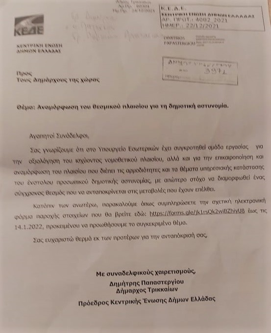 Παράλληλα και με τις πιέσεις εκ μέρους της ΚΕΔΕ, τελικά δημοσιεύτηκε σε ΦΕΚ η σύσταση ειδικής επιτροπής με πρόεδρο τον Γ.Γ. του υπουργείου Εσωτερικών, με αντικείμενο εξέτασης την αναδιάρθρωση, τον εκσυγχρονισμό και την ενίσχυση της δημοτικής αστυνομίας διαφόρων πόλεων.