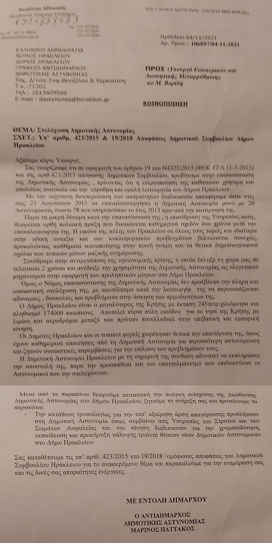 Μετά την αναφορά προς τον σημερινό Υπουργό Εσωτερικών για την υποστελέχωση της Δημοτικής Αστυνομίας και το έγγραφο που κατέθεσε στο γραφείο του Μ.Βορίδη ο ίδιος ο Μ.Παττακός.