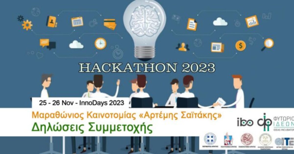 Στο πλαίσιο του τριημέρου καινοτομίας της Περιφέρειας Κρήτης «InnoDays 2023 – Η Κρήτη της Γνώσης και της Παραγωγής», 24-26 Νοεμβρίου 2023, διοργανώνεται Μαραθώνιος Καινοτομίας «Αρτέμης Σαϊτάκης» (Hackathon), που θα διεξαχθεί το Σάββατο 25 και την Κυριακή 26 Νοεμβρίου 2023 στο Διεθνές Εκθεσιακό Κέντρο Κρήτης (Γούρνες, Γούβες Ηρακλείου). Στόχος της διοργάνωσης είναι η προώθηση, δικτύωση και επιβράβευση ιδεών, προτάσεων και εφαρμογών που συμβάλλουν στην καινοτόμο επίλυση προβλημάτων μέσω της κινητοποίησης του δημιουργικού ανθρώπινου κεφαλαίου του νησιού μας.