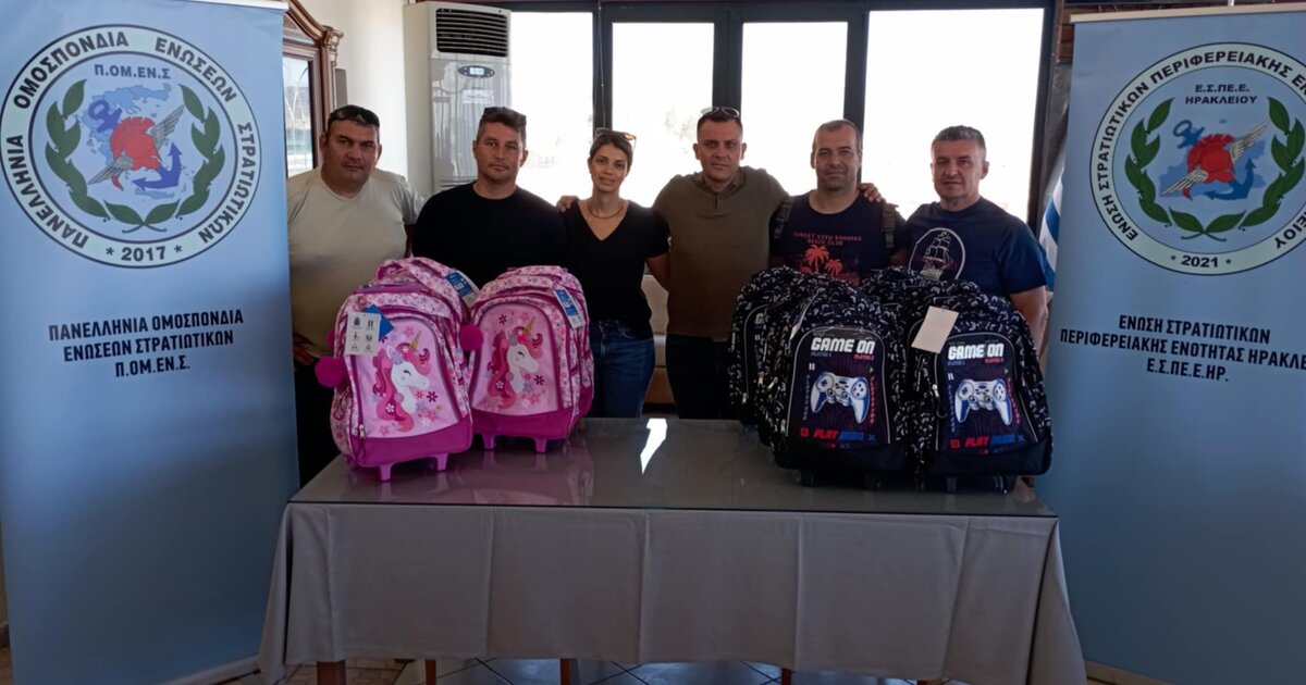 Η Ένωση Στρατιωτικών Περιφερειακής Ενότητας Ηρακλείου, για 1η χρονιά φέτος μετά από απόφαση του Διοικητικού Συμβουλίου αποφάσισε να δωρίσει σχολικές τσάντες και γραφική ύλη στα παιδιά των εγγεγραμμένων μελών της που θα φοιτήσουν στην Α' Δημοτικού την σχολική χρονιά 2025 – 2026.