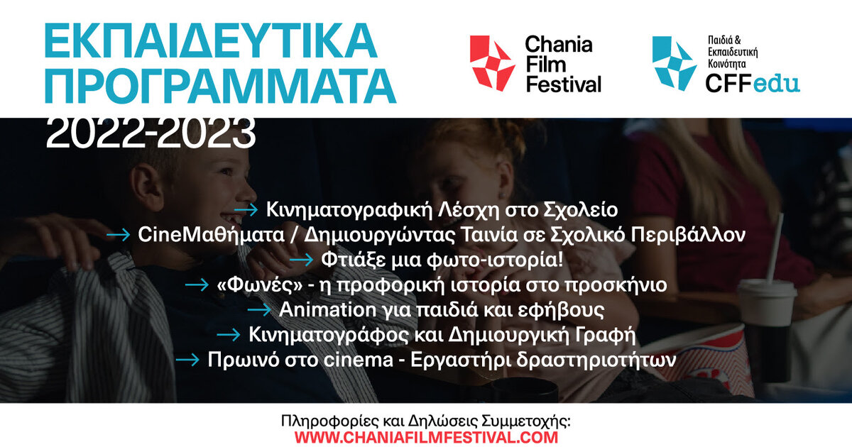 Σημειώνεται ότι και για το σχολικό έτος 2022-23, η συμμετοχή σε όλα τα εκπαιδευτικά προγράμματα και τις Δράσεις του Φεστιβάλ Κινηματογράφου Χανίων γίνεται χωρίς τ την οικονομική επιβάρυνση των Εκπαιδευτικών και των μαθητών/τριών που τα παρακολουθούν.
