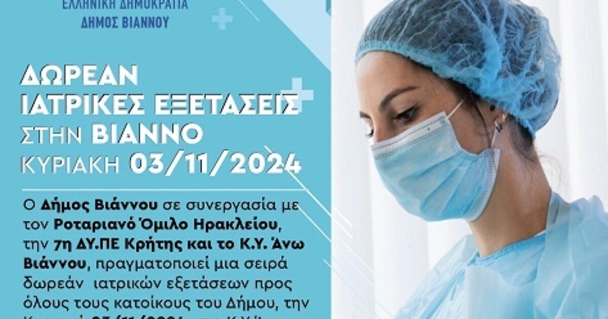 Ο Δήμος Βιάννου σε συνεργασία με τον Ροταριανό Όμιλο Ηρακλείου, την 7Η ΔΥ.ΠΕ Κρήτης και το Κ.Υ. Άνω Βιάννου πραγματοποιεί σειρά δωρεάν ιατρικών εξετάσεων προς όλους τους κατοίκους του Δήμου την Κυριακή 03/11/2024 στο Κ.Υ Άνω Βιάννου από τις 10:00 έως 14:00. Η εθελοντική αυτή δράση αποτελεί συνέχεια αντίστοιχων δράσεων που είχαν υλοποιηθεί.