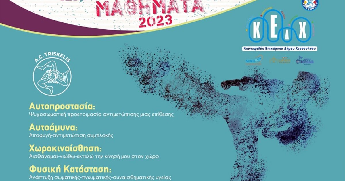 Η Κοινωφελής Επιχείρηση Δήμου Χερσονήσου (Κ.Ε.Δ.Χ.) συνεχίζει και φέτος τις δράσεις ανάπτυξης του αθλητισμού, διασφαλίζοντας για τρίτη συνεχή χρονιά τα δωρεάν μαθήματα Φυσικής Αγωγής και Αυτοάμυνας για όλους, σε συνεργασία με τον Αθλητικό Σύλλογο «Tρισκελής».