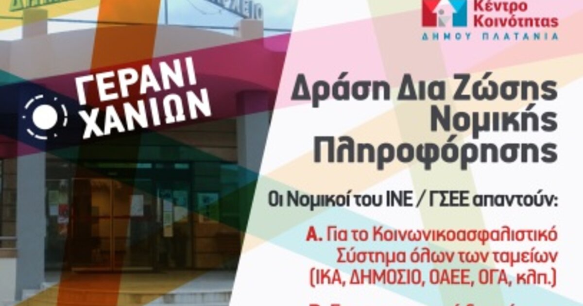 Το Δίκτυο Υπηρεσιών Πληροφόρησης και Συμβουλευτικής Εργαζομένων και Ανέργων του ΙΝΕ ΓΣΕΕ, σε συνεργασία με το Κέντρο Κοινότητας του Δήμου Πλατανιά και την υποστήριξη του Εργατοϋπαλληλικού Κέντρου Χανίων, διοργανώνει Δωρεάν Δράση Δια Ζώσης Νομικής Πληροφόρησης, την Τρίτη 4 Απριλίου 2023, 10.00 – 15.30, στην Αίθουσα του Δημαρχείου Πλατανιά στο Γεράνι.