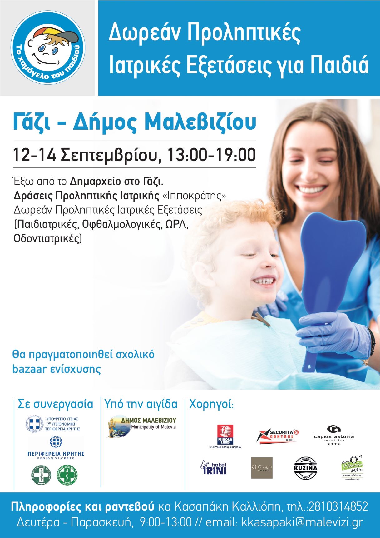Συγκεκριμένα θα πραγματοποιηθούν δωρεάν προληπτικές παιδιατρικές, οδοντιατρικές, οφθαλμολογικές και ωτορινολαρυγγολογικές εξετάσεις σε παιδιά/μαθητές, καθώς και Σχολικό Bazaar Ενίσχυσης του Οργανισμού, στην Πλατεία Μιχ. Κατσαμάνη στο Γάζι από την Δευτέρα 12 μέχρι και την Τετάρτη 14 Σεπτεμβρίου.