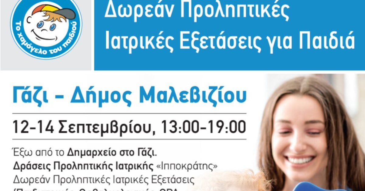 Από την Δευτέρα 12 έως και την Τετάρτη 14 Σεπτεμβρίου 2022, στο πλαίσιο της Δράσης Προληπτικής Ιατρικής / Οδοντιατρικής «ΙΠΠΟΚΡΑΤΗΣ» που υλοποιεί ο Οργανισμός «Το Χαμόγελο του Παιδιού» από το 2002, θα πραγματοποιηθούν δωρεάν προληπτικές παιδιατρικές, οδοντιατρικές, οφθαλμολογικές και ωτορινολαρυγγολογικές εξετάσεις σε παιδιά/μαθητές, καθώς και Σχολικό Bazaar Ενίσχυσης του Οργανισμού, στο Δημαρχείο Γαζίου του Δήμου Μαλεβιζίου.