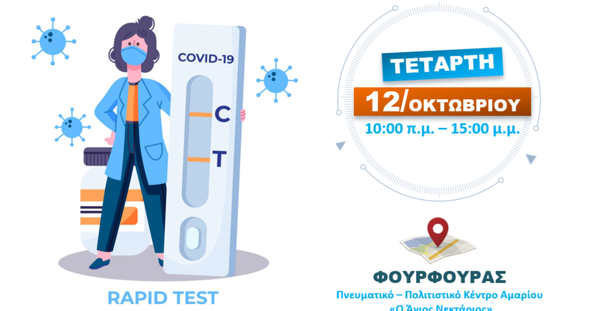 Την Τετάρτη 12 Οκτωβρίου 2022, κατά τις ώρες 10:00 π.μ. έως 15:00 μ.μ., κλιμάκια του ΕΟΔΥ σε συνεργασία με τον Δήμο Αμαρίου θα πραγματοποιούν δωρεάν rapid test για τον Covid-19 στο χώρο της αίθουσας του Πνευματικού - Πολιτιστικού Κέντρου Αμαρίου «Ο ΄Άγιος Νεκτάριος».