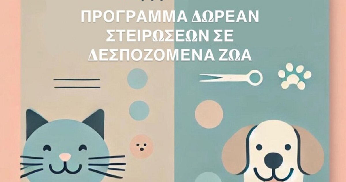 Ο Δήμος Χανίων ενεργοποιεί για ακόμα μια φορά το πρόγραμμα δωρεάν στείρωσης δεσποζόμενων ζώων συντροφιάς πολιτών, οι οποίοι διαμένουν εντός των διοικητικών ορίων του Δήμου Χανίων και ανήκουν στις παρακάτω ευαίσθητες και ευπαθείς κοινωνικές ομάδες: