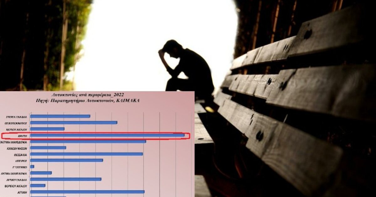 Αύξηση σχεδόν 25% στις αυτοκτονίες στην Ελλάδα από το 2020 ως το 2022, με την Κρήτη να καταγράφει για το 2022 δραματική πρωτιά, σε ποσοστό 17% στο συνολικό αριθμό θανάτων, δείχνουν τα στοιχεία που καταγράφηκαν, αναλύθηκαν και επεξεργάστηκαν από το Παρατηρητήριο Αυτοκτονιών, το ερευνητικό δίκτυο καταγραφής του Κέντρου Ημέρας για την Πρόληψη της Αυτοκτονίας της ΚΛΙΜΑΚΑ.