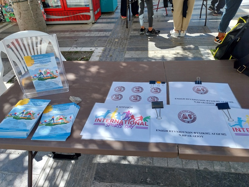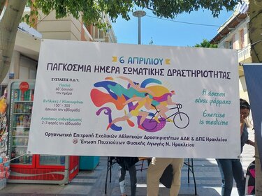 Η Ένωση Πτυχιούχων Φυσικής Αγωγής νομού Ηρακλείου (Ε.Π.Φ.Α.Ν.Η.), με αφορμή την Παγκόσμια Ημέρα Αθλητισμού για την Ανάπτυξη και την Ειρήνη διοργάνωσε εκδήλωση η οποία περιλάμβανε ποικίλες δράσεις για μικρούς και μεγάλους, με στόχο την προώθηση της φυσικής δραστηριότητας και την ενίσχυση της σημασίας του αθλητισμού στην καθημερινή ζωή.