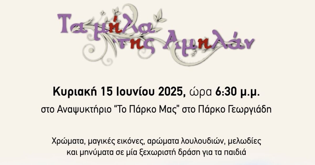 «Τα μήλα της Αμηλάν», ένα παραμύθι που βρίσκεται «επί του πιεστηρίου» για τις δεξιότητες και τη διαφορετικότητα θα ξεδιπλώσει τα χρώματα, τις μαγικές του εικόνες, τα μηνύματα, τα αρώματα των λουλουδιών και τις μελωδίες του σε όσους βρεθούν στο Πάρκο Γεωργιάδη το απόγευμα της Κυριακής 15 Ιουνίου.