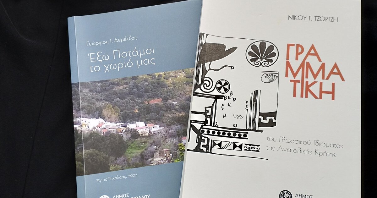 Πρόκειται για το βιβλίο του κ. Νίκου Γ. Τζώρτζη : “ΓΡΑΜΜΑΤΙΚΗ του Γλωσσικού Ιδιώματος της Ανατολικής Κρήτης”, μια μελέτη που παρουσιάζει το Γλωσσικό Ιδίωμα της Ανατολικής Κρήτης (γραμματικά φαινόμενα) που ως στόχο έχει ν΄ αποτελέσει ένα χρήσιμο οδηγό για τους νέους μελετητές της κρητικής γραμματείας και το βιβλίο του Γ. Ι. Δεμέτζου : “Έξω Ποτάμοι το χωριό μας” που σύμφωνα με τον συγγραφέα, θα βοηθήσει τους νέους που ενδιαφέρονται να μάθουν πληροφορίες για τις οικογένειες του χωριού, αλλά και τους παλιούς να θυμηθούν γεγονότα και πρόσωπα μιας άλλης εποχής.