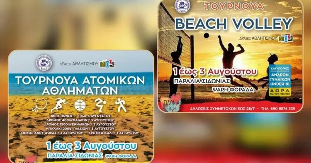 Ο αθλητικός και ναυτικός Όμιλος Καλαμίου, διοργανώνει την εβδομάδα Αθλητικών, και Πολιτιστικών εκδηλώσεων, μέχρι τις 2 Αυγούστου 2025, με την επωνυμία «Σιδωνία 2025», με την υποστήριξη του Δήμου Βιάννου στην παραλία της Ψαρής Φοράδας και προκηρύσσει τους παρακάτω αγώνες: