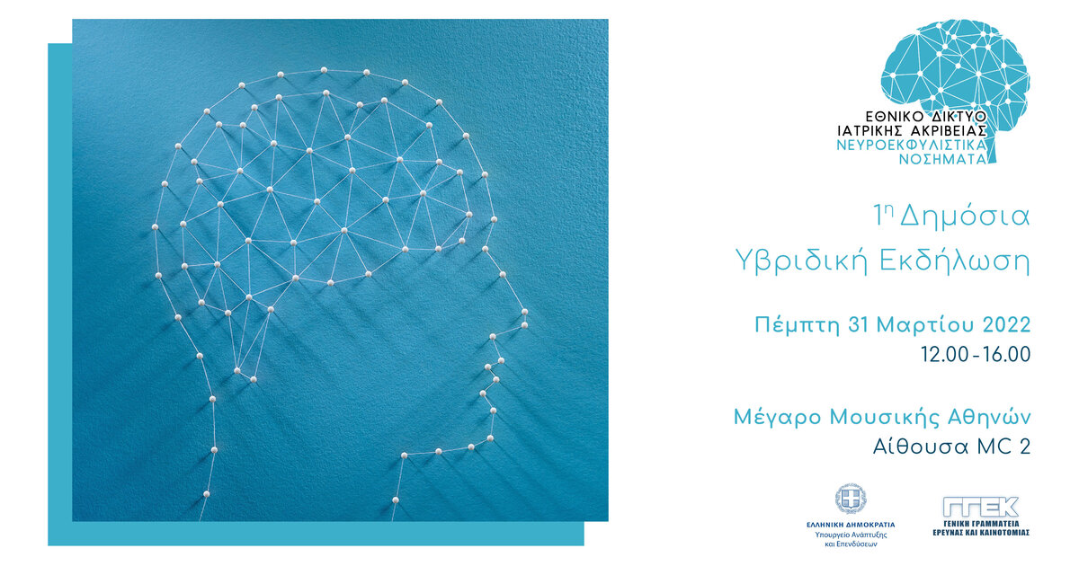 Τις δράσεις τις οποίες θέτει στην υπηρεσία των πολιτών παρουσιάζει για πρώτη φορά στο ευρύ κοινό το Εθνικό Δίκτυο Ιατρικής Ακριβείας στη βάση των Νευροεκφυλιστικών Νοσημάτων (ΕΔΙΑΝ). Η εκδήλωση θα πραγματοποιηθεί στις 31 Μαρτίου 2022 στο Μέγαρο Μουσικής Αθηνών και το κοινό θα έχει την ευκαιρία να την παρακολουθήσει είτε δια ζώσης είτε διαδικτυακά, κατόπιν εγγραφής.