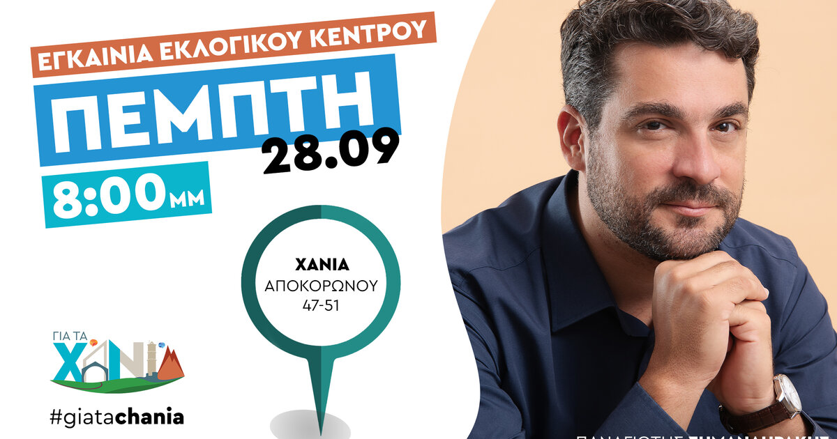 Ο χώρος που στεγάζει τον συνδυασμό βρίσκεται στην οδό Αποκορώνου 47-51 στο κέντρο της πόλης και τα εγκαίνια θα πραγματοποιηθούν την Πέμπτη 28 Σεπτεμβρίου 2023 στις 20:00, με την παρουσία του Δήμαρχου Χανίων κι εκ νέου υποψηφίου, Παναγιώτη Σημανδηράκη και του συνόλου της ομάδας.
