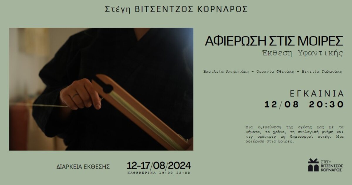 Τα εγκαίνια της έκθεσης υφαντικής "Αφιέρωση στις Μοίρες" όπου θα παρουσιάσουν έργα τους η Βασιλεία Ανηψητάκη, η Ουρανία Φθενάκη και η Βενετία Γαλανάκη και θα τις συνοδεύσει μουσικά η Φιλοθέη Αλεξάκη (ούτι, φωνή), θα πραγματοποιηθούν την ερχόμενη Δευτέρα 12 Αυγούστου, στις 20:30 το βράδυ.