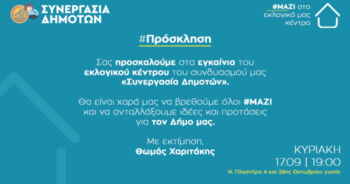 Το εκλογικό της κέντρο εγκαινιάζει το απόγευμα της ερχόμενης Κυριακής η παράταξη "Συνεργασία Δημοτών" με επικεφαλής και υποψήφιο δήμαρχο Αγίου Νικολάου τον Θωμά Χαριτάκη.