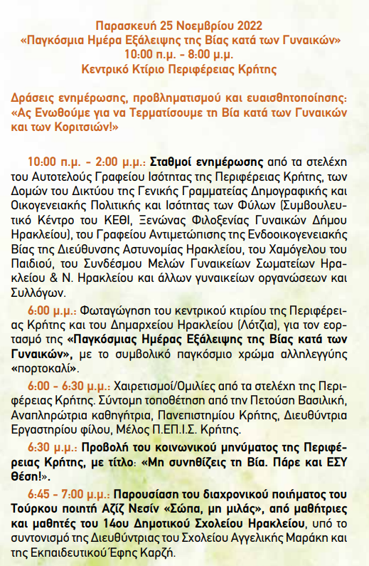 Στις 6:00 το απόγευμα θα φωταγωγηθεί το κεντρικό κτίριο της Περιφέρειας Κρήτης με πορτοκαλί χρώμα, το παγκόσμιο χρώμα αλληλεγγύης, που επιλέχθηκε με την ελπίδα και αισιοδοξία για ένα πιο φωτεινό μέλλον για τις γυναίκες και τα κορίτσια. Επίσης, θα υπάρξουν χαιρετισμοί/ομιλίες από τα στελέχη της Περιφέρειας Κρήτης και σύντομη τοποθέτηση από τη Βασιλική Πετούση, Αναπληρώτρια καθηγήτρια, Τμήμα Κοινωνιολογίας, Πανεπιστήμιο Κρήτης, Διευθύντρια του Εργαστηρίου Φύλου και μέλος της Π.ΕΠ.Ι.Σ. Κρήτης. Στη συνέχεια θα προβληθεί το κοινωνικό μήνυμα (σποτ) της Περιφέρειας Κρήτης, με τίτλο: «Μη συνηθίζεις τη Βία. Πάρε και ΕΣΥ Θέση!».