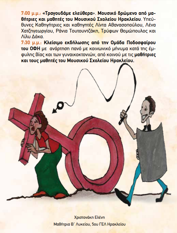 Σημαντική θα είναι και η συνεισφορά της σχολικής κοινότητας στις δράσεις. Συγκεκριμένα, οι μαθητές και οι μαθήτριες του 14ου Δημοτικού Σχολείου Ηρακλείου θα παρουσιάσουν το διαχρονικό ποίημα του Τούρκου ποιητή Αζίζ Νεσίν «Σώπα, μη μιλάς», υπό το συντονισμό της Διευθύντριας του Σχολείου Αγγελικής Μαράκη και της Εκπαιδευτικού Έφης Καρζή. Επίσης, οι μαθήτριες και οι μαθητές του Μουσικού Σχολείου Ηρακλείου, θα πραγματοποιήσουν το μουσικό δρώμενο «Τραγουδάμε Ελεύθερα», με υπεύθυνους εκπαιδευτικούς τη Λίντα Αθανασοπούλου, τη Λένα Χατζηγεωργίου, τη Ράνια Τουτουντζάκη, τον Τρύφωνα Θωμόπουλο και τη Λίλυ Δάκα. Τέλος, η ομάδα ποδοσφαίρου του ΟΦΗ, από κοινού με τους μαθητές και τις μαθήτριες, θα στείλουν ένα ηχηρό μήνυμα κατά της έμφυλης βίας.