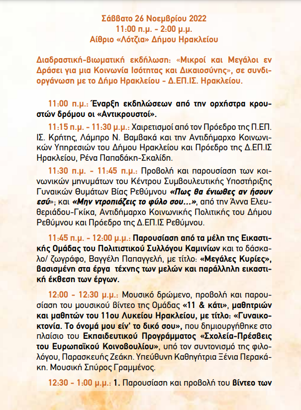 Σάββατο 26 Νοεμβρίου 2022, 11:00 π.μ. - 2:00 μ.μ.. Αίθριο της «Λότζια», σε συνδιοργάνωση με το Δήμο Ηρακλείου - Δ.ΕΠ.ΙΣ. Ηρακλείου, διαδραστική-βιωματική εκδήλωση, με τίτλο: «Μικροί και Μεγάλοι εν Δράσει για μια Κοινωνία Ισότητας και Δικαιοσύνης».