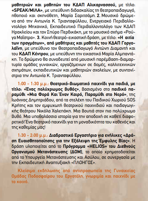 Αμέσως μετά θα πραγματοποιήσουν τις δράσεις τους τα ΚΔΑΠ του Δήμου Ηρακλείου: 1. Παρουσίαση και προβολή του βίντεο των μαθητριών και μαθητών του ΚΔΑΠ Αλικαρνασσού, με τίτλο: «SPEAK/ΜΙΛΑ», με υπεύθυνη διδασκαλίας τη Θεατροπαιδαγωγό, ηθοποιό και σκηνοθέτη, Μαρία Σαριτσάμη. 2. Μουσικό δρώμενο από την Αντωνία Κ. Τριανταφύλλου, Ενεργειακό Περιβαλλοντολόγο Μηχανικό, Εκπαιδευτικό Περιβαλλοντολόγο των ΚΔΑΠ Ηρακλείου και τον Σπύρο Περδικάκη, με το μουσικό σχήμα «Ρούγα Μαΐστρα». 3. Κοινή θεατρό-εικαστική δράση, με τίτλο: «Η αιτία των πραγμάτων», από μαθήτριες και μαθητές του ΚΔΑΠ Γοργολαΐνη, με υπεύθυνο τον Θεατροπαιδαγωγό Αντώνη Διαμαντή και του ΚΔΑΠ Κέντρου, με υπεύθυνη την εικαστικό Μαρία Αλμπαντάκη. Το δρώμενο θα συνοδευτεί από μουσική παρέμβαση-διαμαρτυρία ομάδας γυναικών, εργαζόμενων σε δομές, καλλιτεχνικών σχημάτων, εκπαιδευτικών και μαθητριών σχολείων, με συντονίστρια την Αντωνία Κ. Τριανταφύλλου.