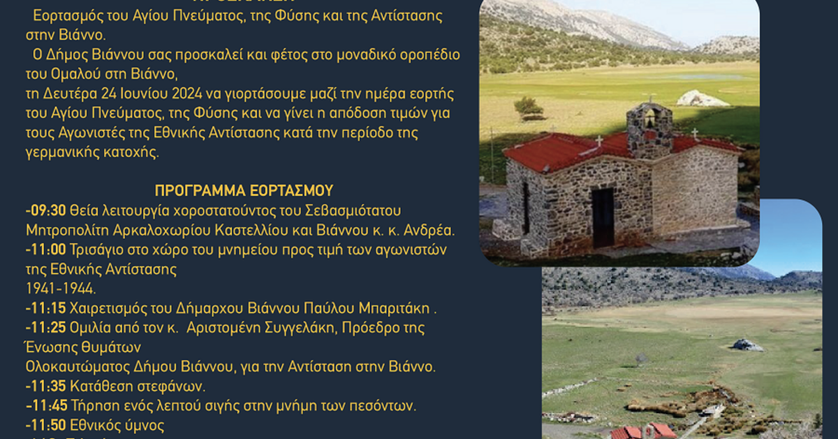 Εκδηλώσεις στη Βιάννο για το Άγιο Πνεύμα, τη Φύση και την Αντίσταση