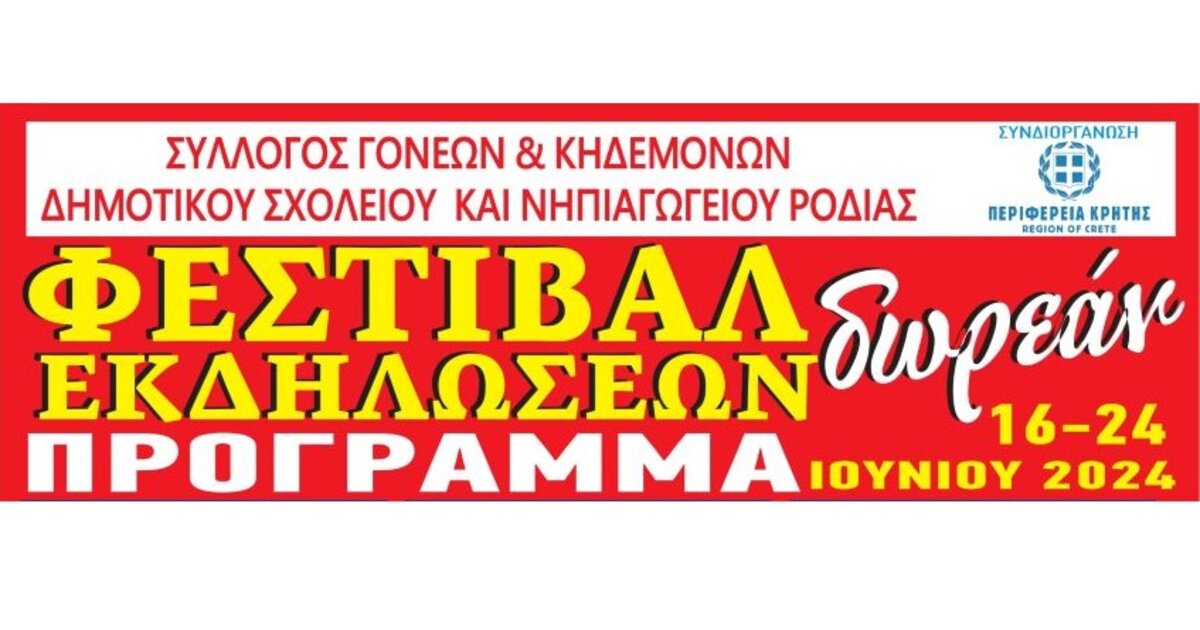 Εκδηλώσεις πραγματοποιεί ο σύλλογος γονέων και κηδεμόνων του δημοτικού σχολείου και νηπιαγωγείου Ροδιάς με την στήριξη της Περιφέρειας Κρήτης. Σύμφωνα με σχετική ανακοίνωση οι εκδηλώσεις έχουν ως εξής: