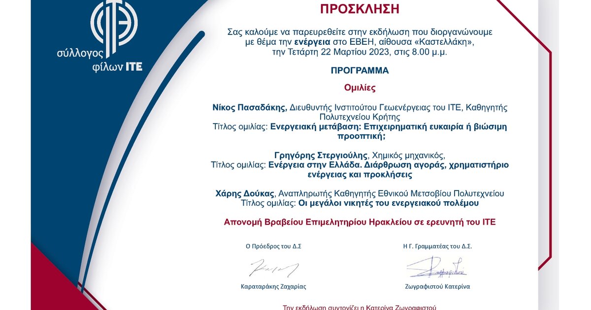 -Ο κ. Νίκος Πασαδάκης, Διευθυντής Ινστιτούτου Γεωενέργειας του ΙΤΕ, καθηγητής Πολυτεχνείου Κρήτης. Τίτλος ομιλίας: Ενεργειακή μετάβαση: Επιχειρηματική ευκαιρία ή βιώσιμη προοπτική;