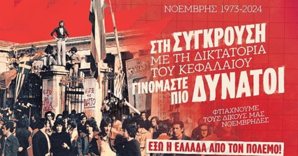 "Έξω οι ΗΠΑ-έξω το ΝΑΤΟ", "Ψωμί-Παιδεία-Ελευθερία": Τα συνθήματα του ξεσηκωμού του Πολυτεχνείου και της αντιδικτατορικής πάλης παραμένουν ζωντανά και επίκαιρα, στον αγώνα για μια κοινωνία χωρίς πολέμους , φτώχεια, αδικία, φασισμό. Μας δείχνουν τον δρόμο για ακόμα πιο αποφασιστικούς , μαζικούς και ανυποχώρητους αγώνες, για τους δικούς μας Νοέμβρηδες , για νέους λαϊκούς ξεσηκωμούς. Για να φτάσει ο αγώνας μέχρι το τέλος, μέχρι την επαναστατική ανατροπή του εκμεταλλευτικού καπιταλιστικού συστήματος, την εγκαθίδρυση μιας πραγματικής εργατικής-λαϊκής εξουσίας και διακυβέρνησης, που θα ηγηθεί στην οικοδόμηση μιας νέας κοινωνίας στην Ελλάδα, χωρίς εκμετάλλευση ανθρώπου από άνθρωπο, του σοσιαλισμού-κομμουνισμού.
