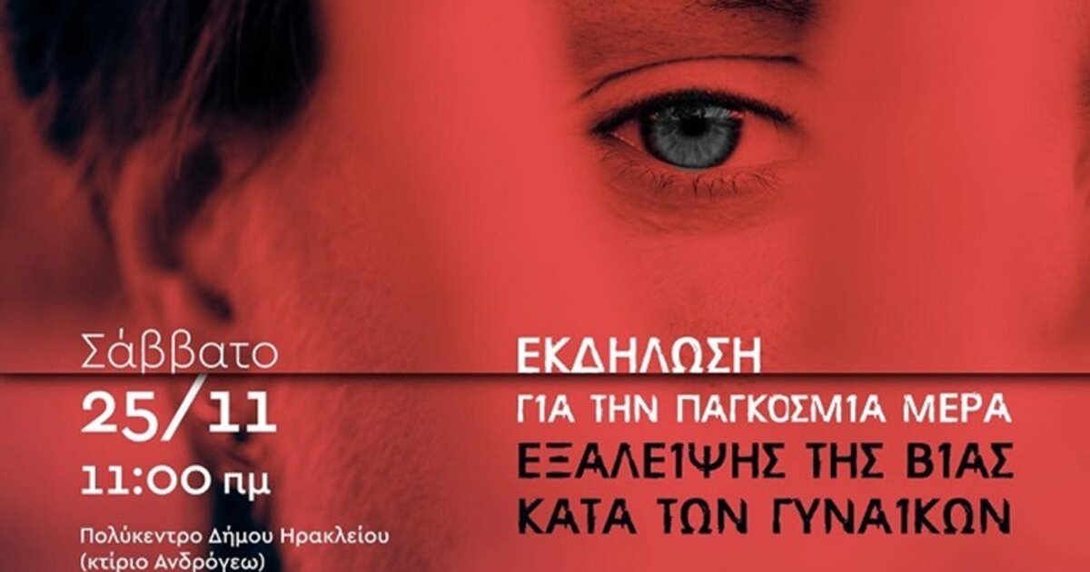 Η Δημοτική Παράταξη "ΗΡΑΚΛΕΙΟ ΓΙΑ ΣΕΝΑ" διοργανώνει εκδήλωση το Σάββατο 25 Νοεμβρίου 2023 στις 11:00 πμ στο Πολύκεντρο του Δήμου Ηρακλείου, με αφορμή την Παγκόσμια Ημέρα Εξάλειψης της Βίας κατά των Γυναικών.